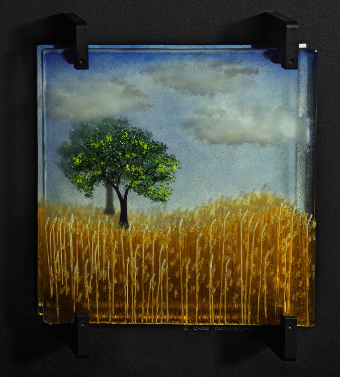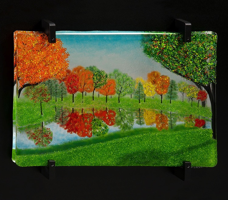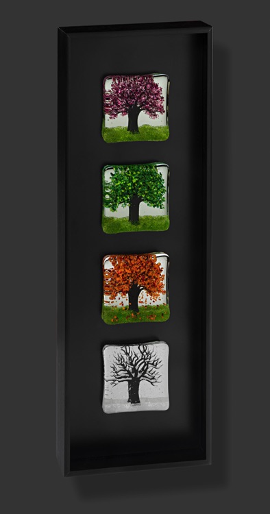 These works are much larger than the others. They are placed in front of a mirror, which has been mounted to a custom-made powder-coated aluminum frame. Both the mirror and the fused tile are held in place using a proprietary custom-made bracket system. These pieces are suitable for a larger wall area, perhaps above a sofa, and these frames can be modified in size to fit the requirements of almost any space. I welcome custom orders.