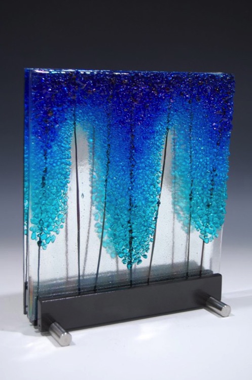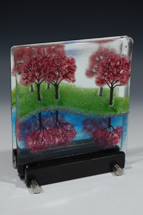 Any piece from the Original series can be made for placement in one of these steel stand frames that hold the glass in place via compression. These stands are available in either 6" or 8" lengths and are perfect for a coffee table, mantle, or bookcase. The fused glass tiles within the stands are approximately 6.75" or 8.75", respectively.